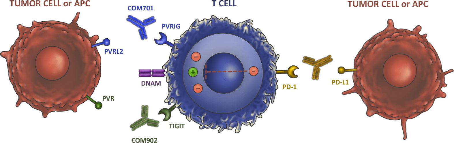 PVRIG is located on the surface of T and NK cells. Our research exploring the PVRIG pathway show that when bound to its ligand, PVRL2, PVRIG inhibits T and NK cell activity. Working in parallel and in complement with PVRIG in the DNAM axis is TIGIT, which was computationally discovered by the Compugen team in 2009. When TIGIT binds its ligand, PVR, it also leads to inhibition of T and NK cell activity.
